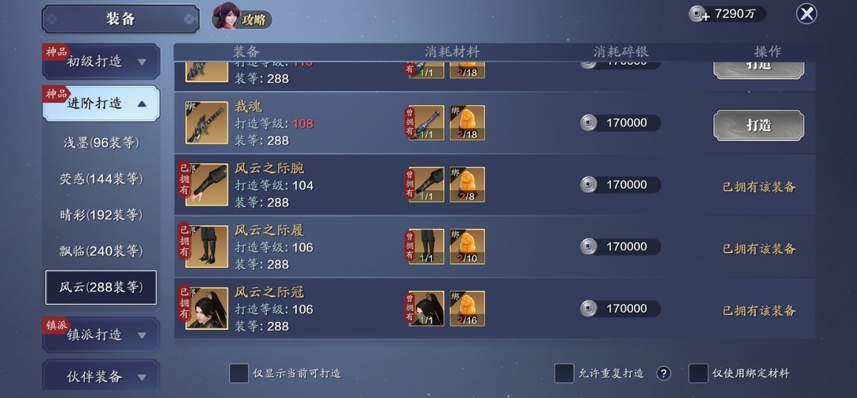 108级只可打造一件主武器,需要预留200个6级霜铁。之前金丝比较短缺,目前大家防具应该都打造的差不多了,后面主要是要预留霜铁。