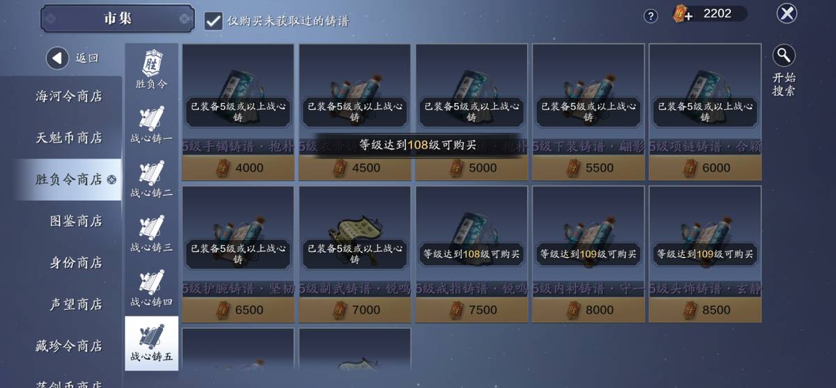 108级可以兑换戒指五级战心铸谱,胜负令需要7500点。本次更新后胜负令商店的神兵定数质料礼价格从1000下调为300,但是还是不建议兑换。后面每级需要换两个战心铸,所以现阶段还是囤一些。