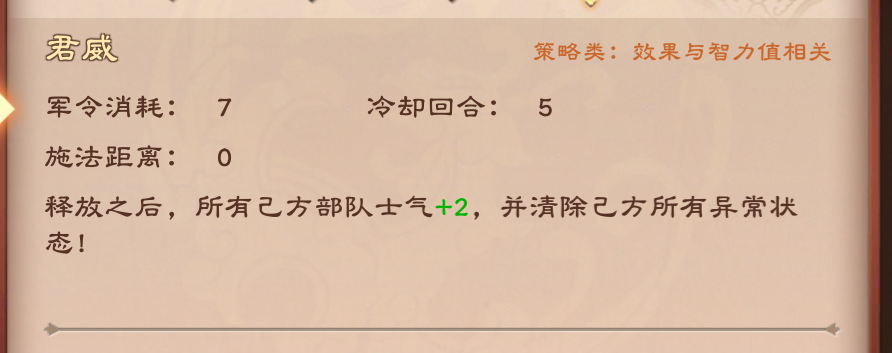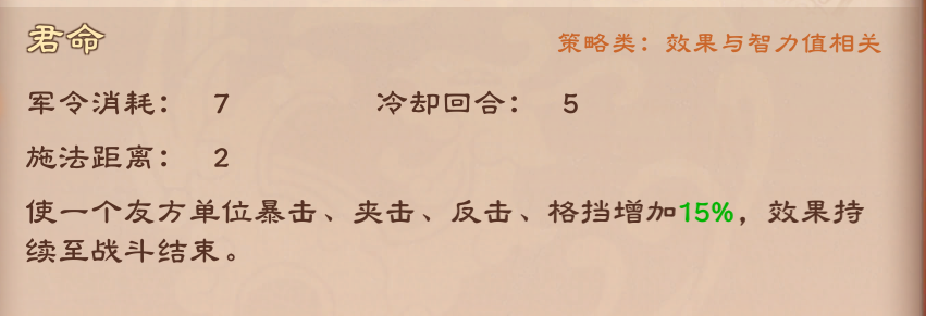 他们分别的技能效果为:天命:自身获得所有阵法效果(拒收、蓄力、奔袭、玄襄阵、金锁阵、钩形阵);君命:使一个单位暴击、夹击、反击、格挡增加15%,效果持续至战斗结束。 君威:释放之后,所有己方部队士气+2,并清除己方所有异常状态!