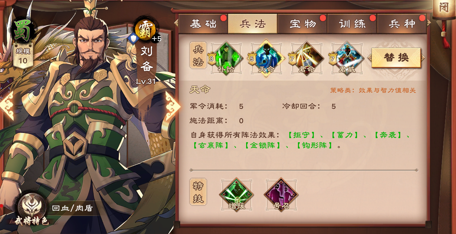 每一个武将突破至相应阶段时就会解锁对应的专属兵法,刘备的专属兵法为:君命、天命,核心兵法:君威。