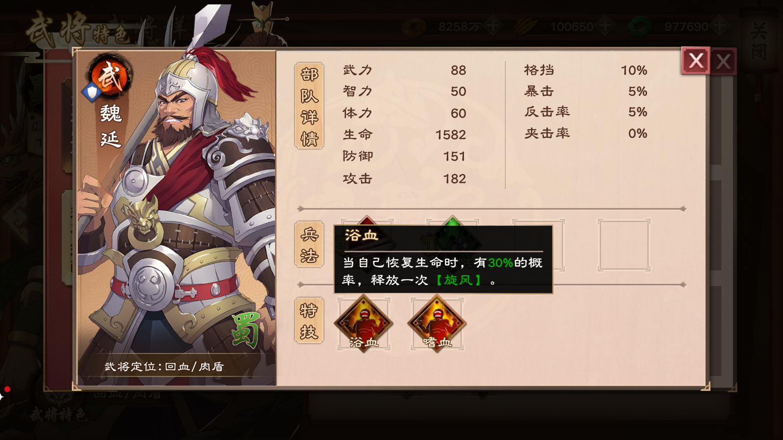 刘备的回血特技可以跟魏延和关平带来极大的帮助,这与关平以及魏延的特技相关,关平的激昂:周围2格范围内任何己方单位生命恢复,则自己士气+1,奋战:当士气大于4时,额外增加65%的攻击;因此与刘备的特技配合能够使关平持续保持高士气的状态,以此能够造成最大的杀伤;魏延的浴血:当自己恢复生命时,有30%的概率释放一次【旋风】(盾兵的战法之一,对自身周围的敌人造成伤害)。配合上刘备就能够有机率给敌方部队造成二次的杀伤!