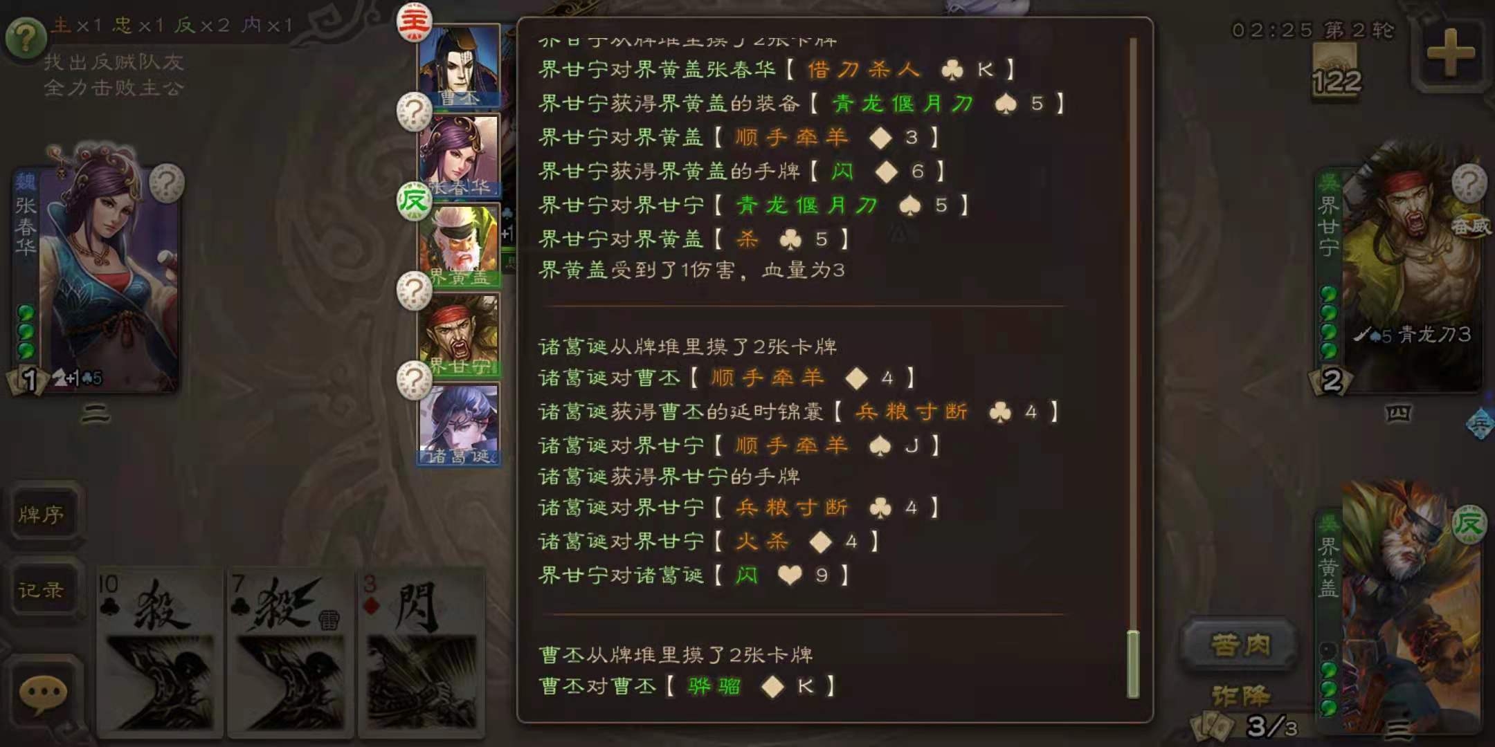 首先这次从一开始的出牌得,只有我们就可以知道,这把张春华是跳反的,不管他身份是内还是反首先开始打的都是主公,那么我们就可以把它默认为队友。但是个人建议是前期尽量不要动曹丕,因为在手上没有红杀和酒的时候,输出和收益不太正比,而这把因为我这时候苦肉获得的牌都是黑鲨,所以说这一回合我选择蓄爆。然后界甘宁,他就开始对我进行了攻击,那么我们就知道界甘宁很有可能是内奸或者是忠臣。但是现在没有出来具体的身份,那么姑且称他为内奸,然后他把我的手牌基本上都要清空了。并且给我造成了一点伤害,然后就到了诸葛诞,诸葛诞的话,他是选择杀界甘宁这个时候我就粗略的认为他是一个忠,因为一开始的话,距离不够,如果是内的话应该杀主公,就是选择跳反贼,但是他选择打界甘宁,我就默认他为忠,而把他设为第一击败目标,然后就是到曹丕,曹丕这一轮依旧是没有打任何输出,但是他是消耗了张春华的一张闪。然后我们由于被甘宁拆了许多的牌,而甘宁由于过度拆牌导致自己的手牌量也只有一张,于是他就被张春华盯上了,张春华给他打了一次输出,然后界甘宁就只剩三滴血了,然后到我的回合,我苦肉摸到两张杀,然后给界甘宁造成了俩点血量,然后界甘宁他只剩一点血了,但是在他的回合,他又摸了桃,之后又被诸葛诞给打了一套,然后成功将其带走。