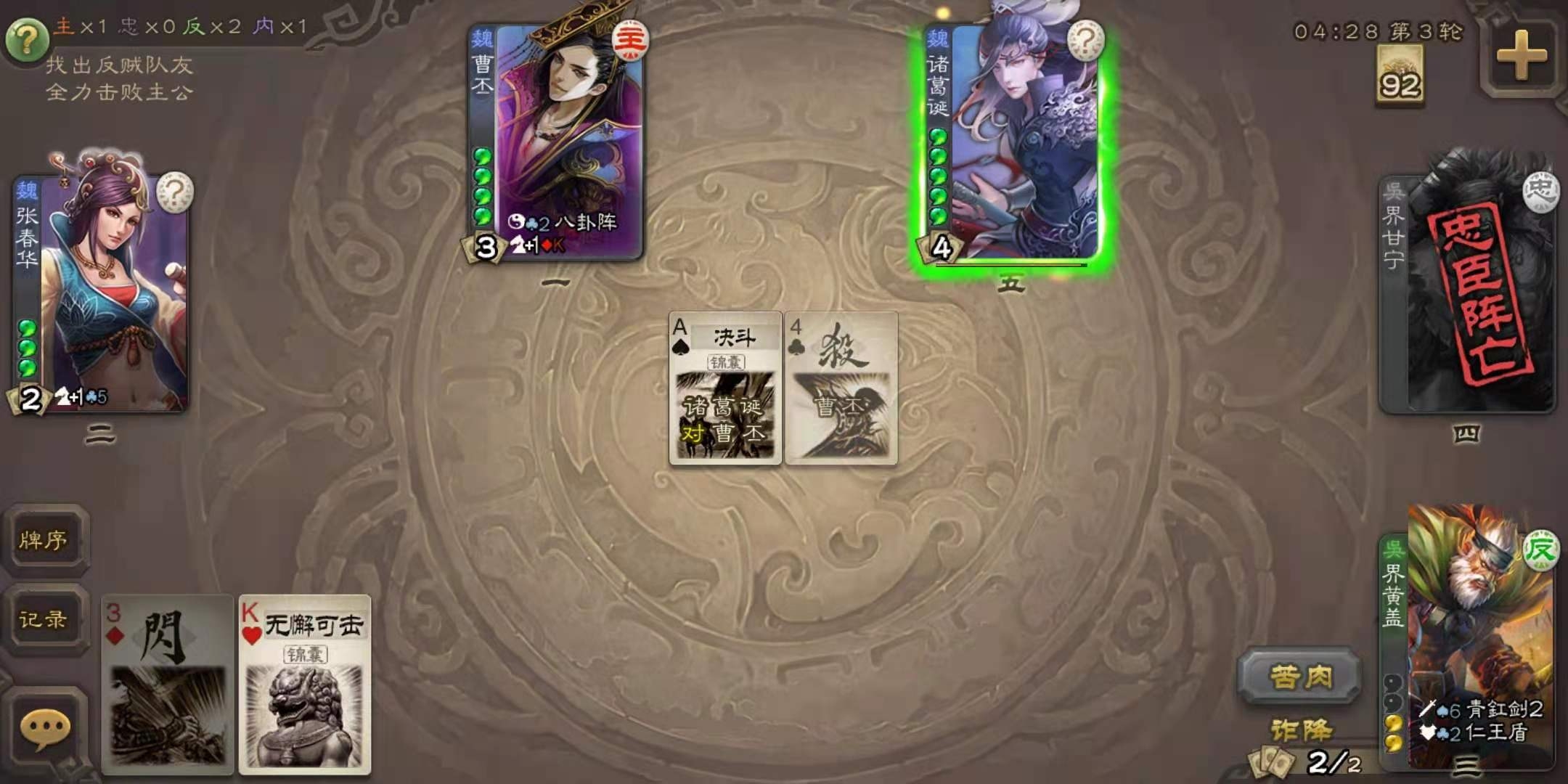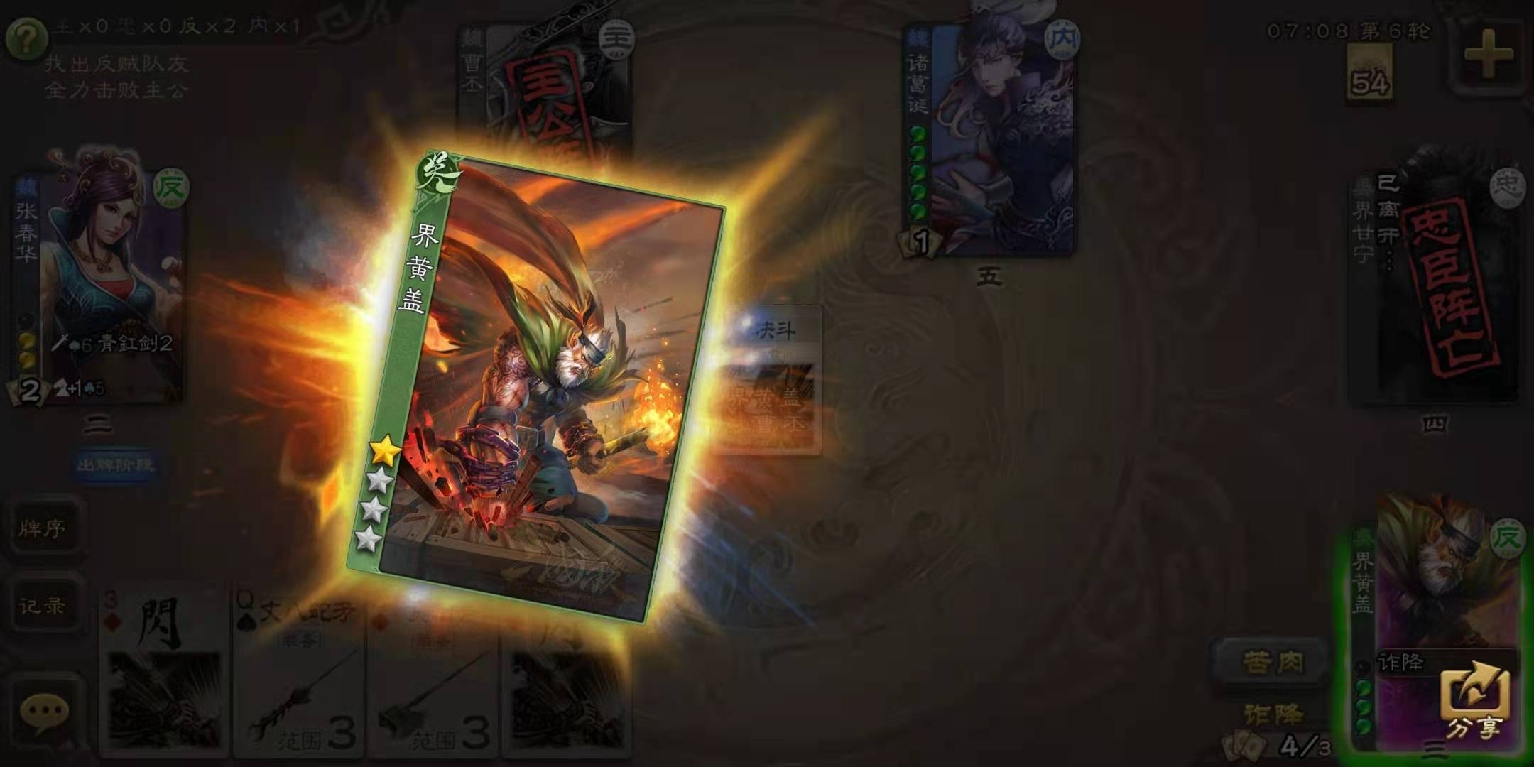然后这个时候我们可以知道甘宁,他的身份是忠臣。然后这个时候我们就直接激火主公,并且张春华在这个时候摸到了核心装备青虹剑,它可以无视主攻的防具,给主公造成伤害。然后由于诸葛诞自知是不可能在我们俩连手下保住主公,于是他就加入了我们的反贼,成功的让我们击杀了主公。还获得了本场游戏的胜利。