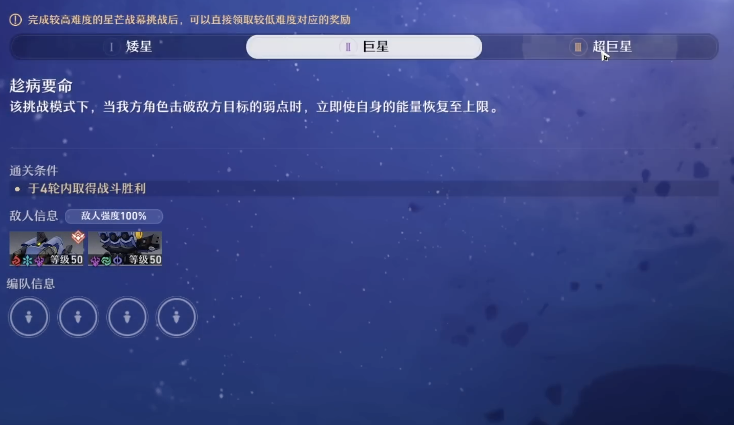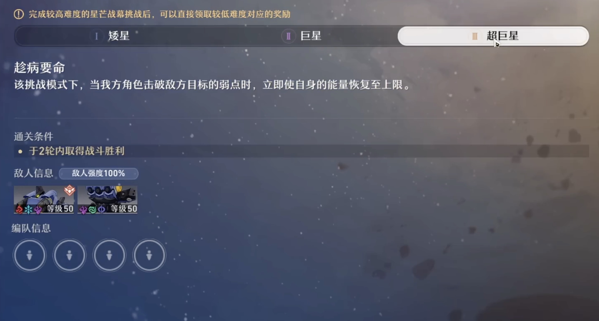 在 4 回合内击败怪物即可,高难度是给氪金大佬秀伤害用的,必须要在两轮内战胜敌人。其实整体难度并不算大,把角色拉一拉,挂机自动就能过。