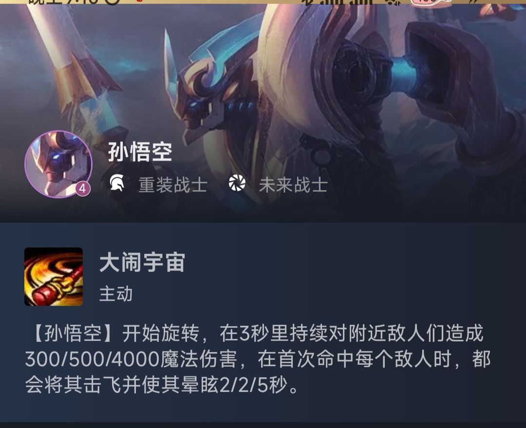 今天我们来介绍一下s3.5激战星海赛季的一张4费棋子孙悟空重装战士加未来战士两个羁绊。这张棋子作为一张4费棋子好像没什么人玩,今天我们就来聊一聊他。欢迎评论。