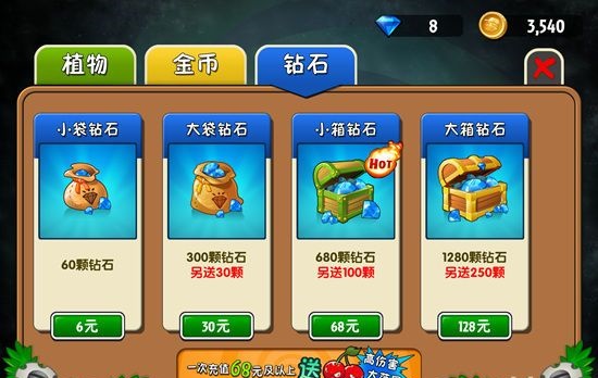 钻石大约是0.8元一颗,400解锁新植物也就是30元左右购买一个,比测试版的价格还贵,不过看在能利用时间解锁的份上,就不吐槽这设定了……