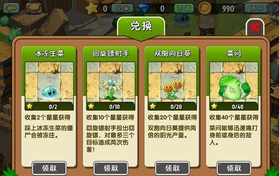 除了地图外,中文版在植物方面也做了较大改动,冰冻生菜、回旋镖射手、菜问(不要吐槽这个名字……)等在测试版前期便能取得植物,在中文版中需要玩家通过一定数额的星星解锁方能使用。