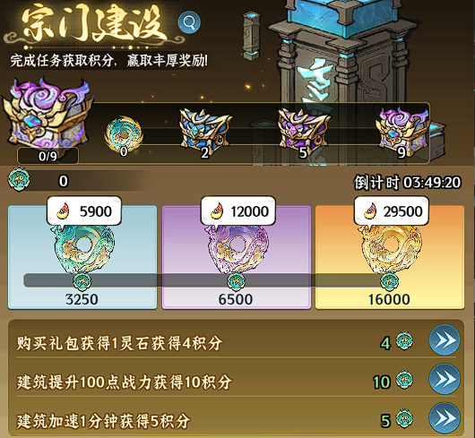 每日00:00:00随机匹配建筑评分相近的宗门参与活动,不同阶段获取不同数量积分,可激活仙玉获得奖励,活动期间,根据激活仙玉次数可获得额外宝箱奖励。仙玉宝箱内奖励丰富。