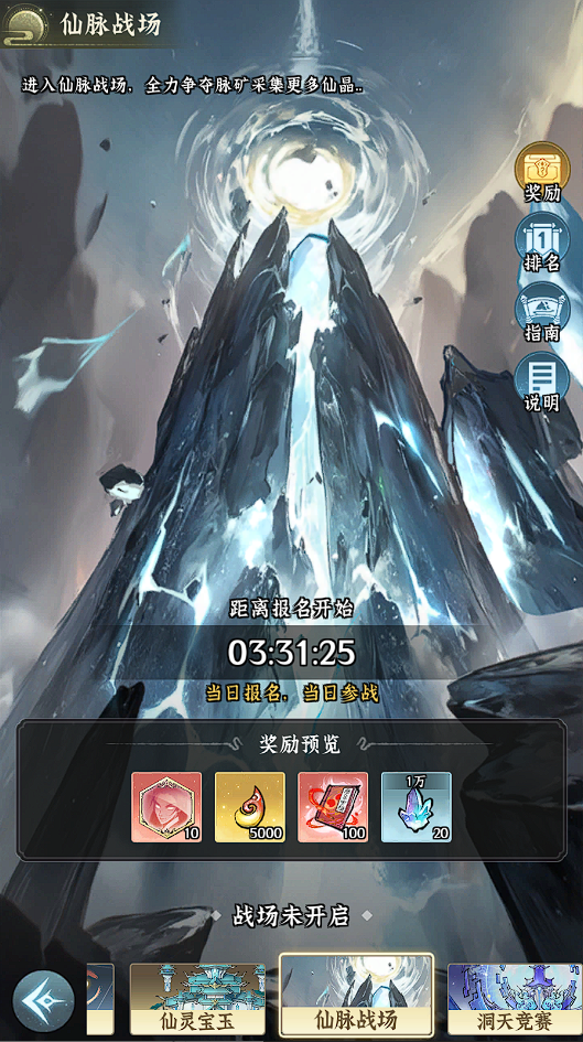 仙脉战场每次开放时间持续30分钟。在战场后期,[仙脉福地]将会开放。活动结束时,将根据占领该建筑的时间长短进行排名,并发放相应的仙晶作为排名奖励,活动倒计时结束,掌门将根据最终获得仙晶总量获取采集奖励和排名奖励。排名奖励极其丰厚。
