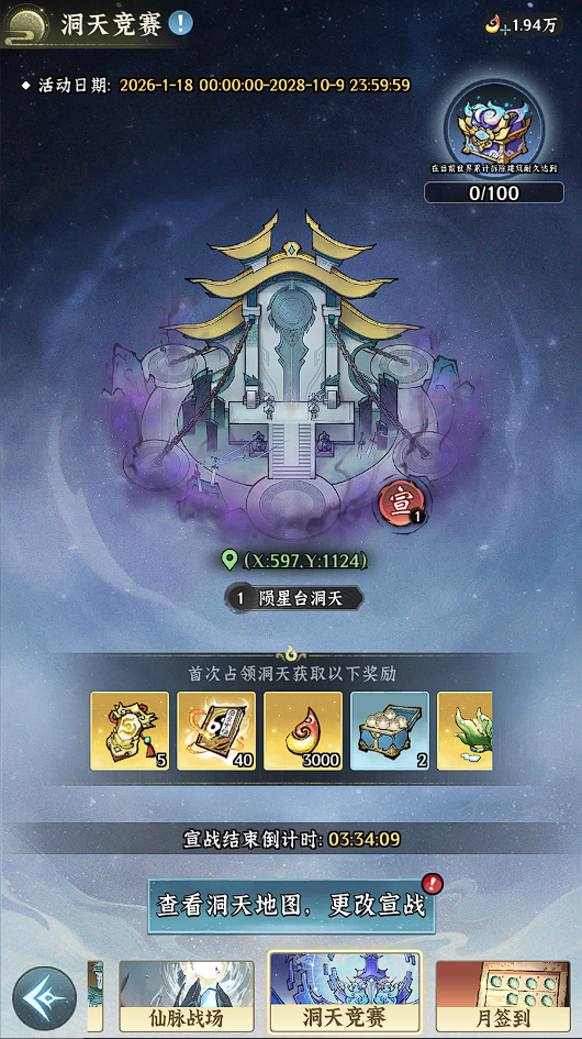 仙盟界面-仙盟领地,宝箱内每日可领取灵石,占领地图上的洞天可以增加仙盟成员每日领取的宝箱奖励。