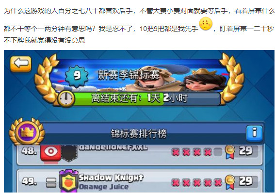 近期有玩家在贴吧抱怨起了竞标赛一个奇怪的现象,那就是大部分玩家都更加倾向于后手出牌,无论大费还是小费。这就导致了贴主本人每次对局都只能先手打开战局,不然就会陷入双方互相干瞪眼一十二秒,什么事都没有干的尴尬。