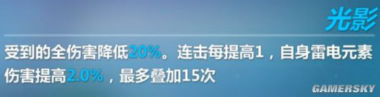 降低受到的全伤害(包括深渊流血),同时根据连击数提供无限制雷伤加成,最多叠加15次(最高30%雷伤加成)。