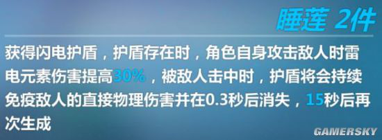 获得闪电护盾,存在期间获得30%雷伤加成。被敌人击中后0.3秒然后消失(期间被击中会被打断,但不会受到伤害)。护盾能够防猝死,在深渊环境中能提高一定的容错率。