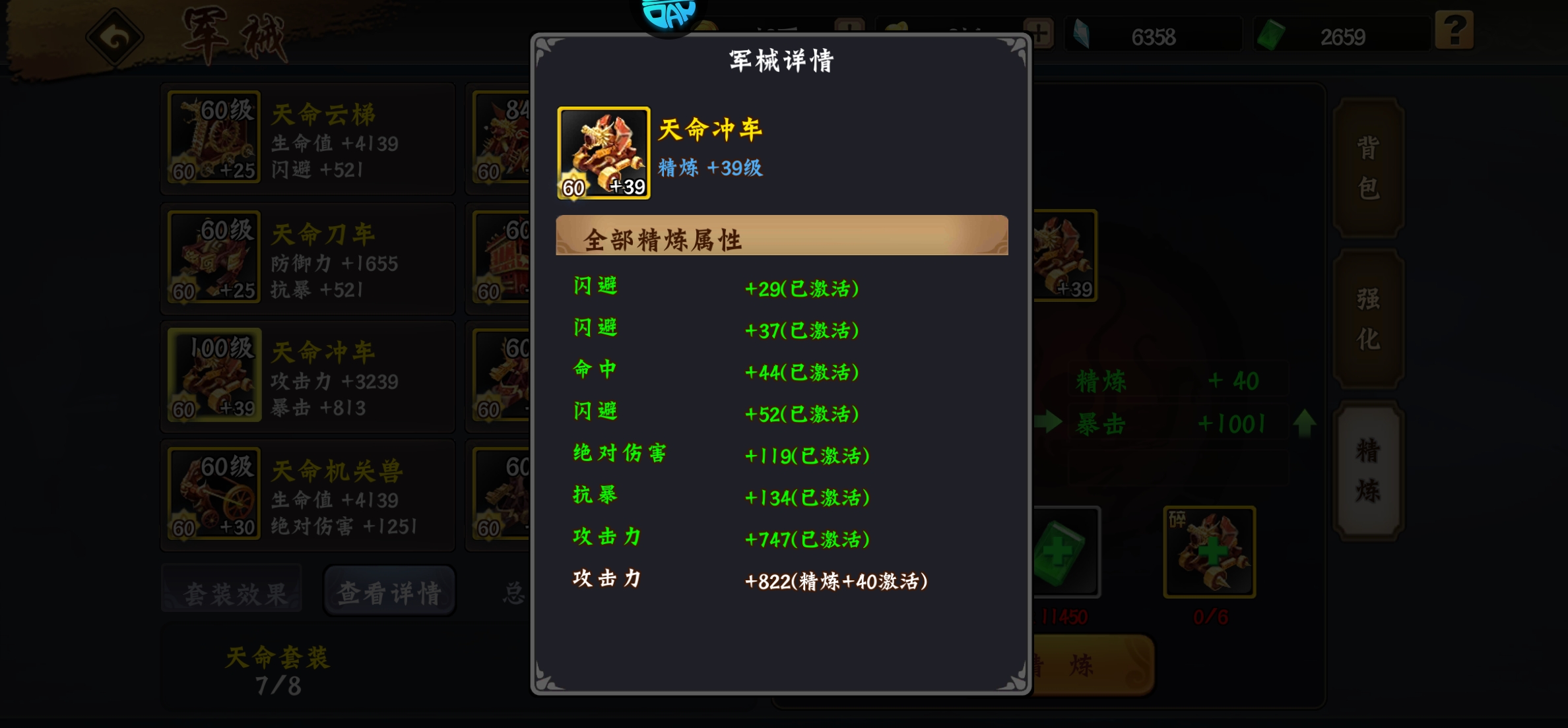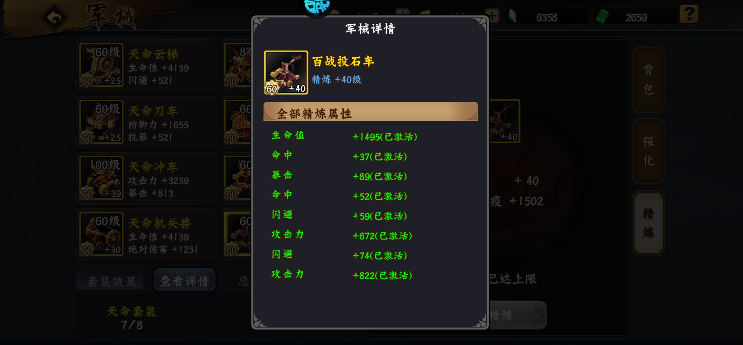 这套里面唯一的百战投石车加672和822攻击,是加攻击仅次于天命冲车的,而天命投石车加攻击太少,这里就不推荐了,老玩家都知道,打百战最主要,除了看暴击,爆伤,命中,最最最主要还是看攻击力的,没有攻击力,前面都是白搭。