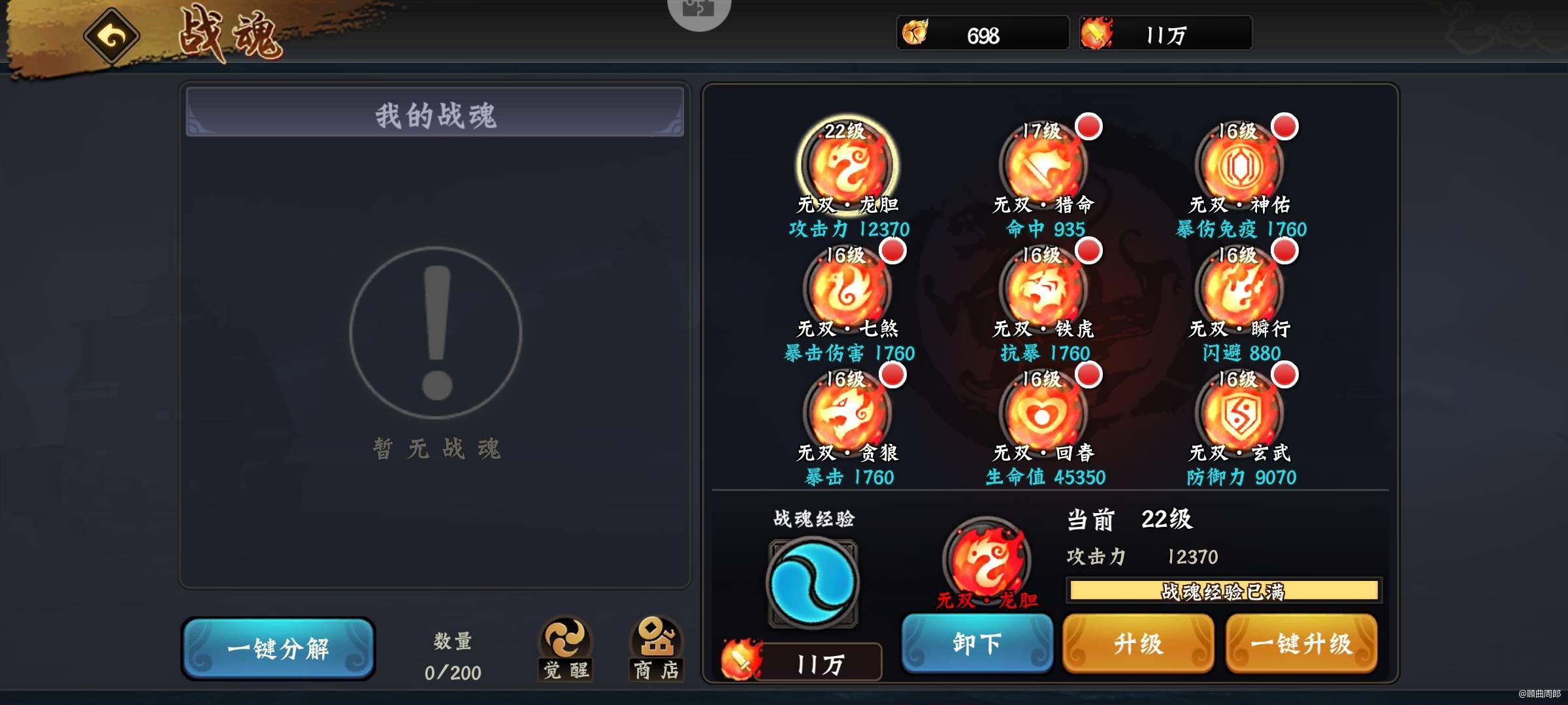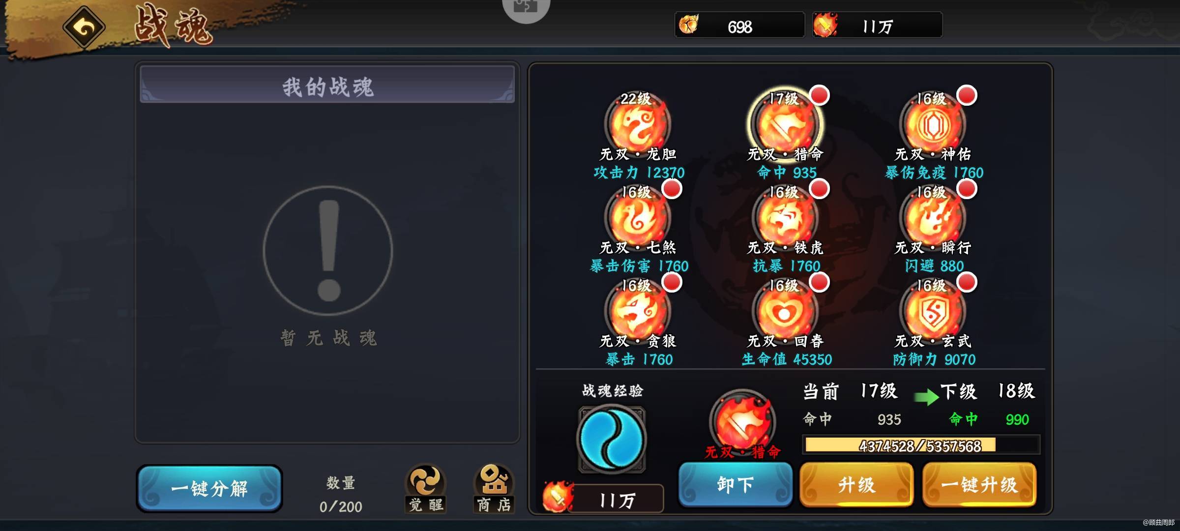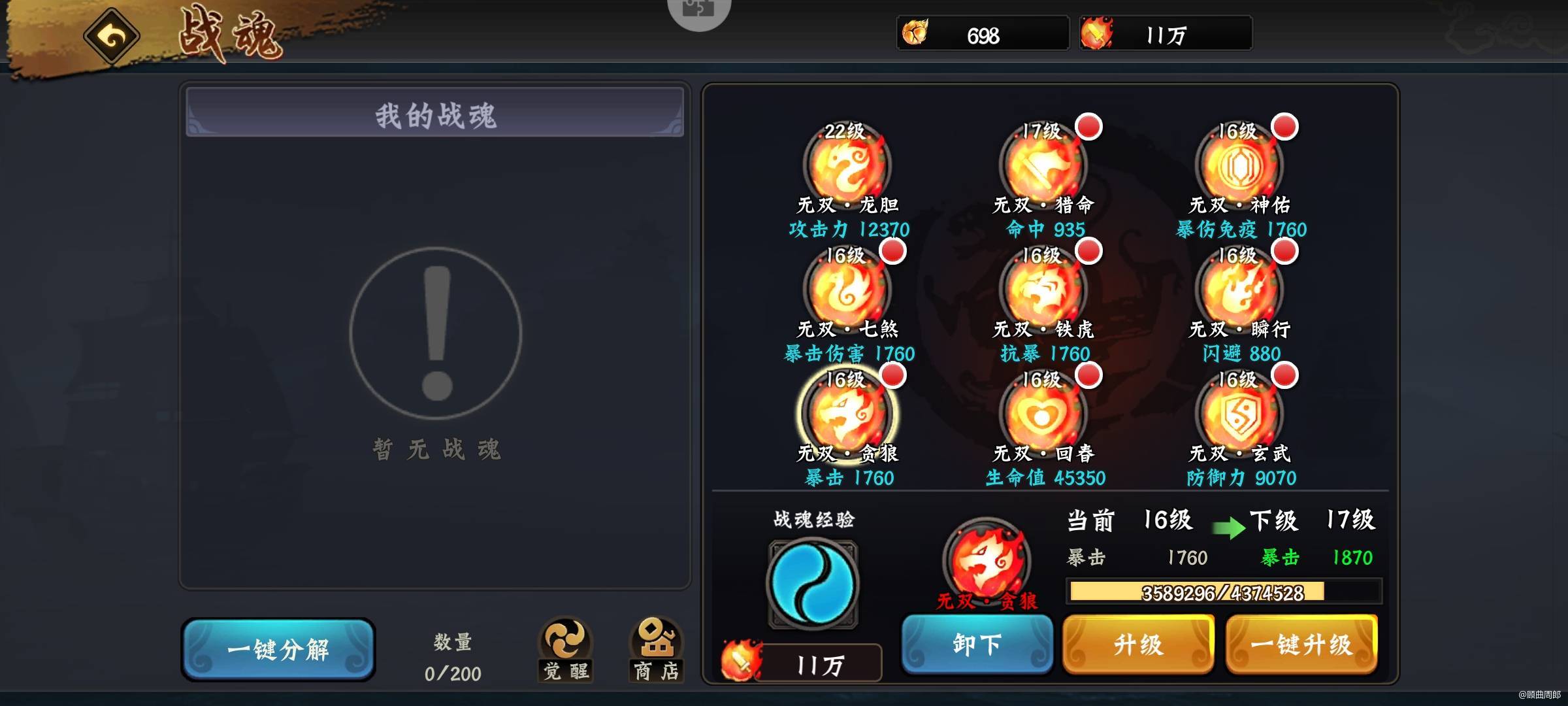 6.无双战魂首四个兑换顺序:1攻击力-2暴击-3暴伤-4命中,防御类的无双战魂不着急,有限升级攻击