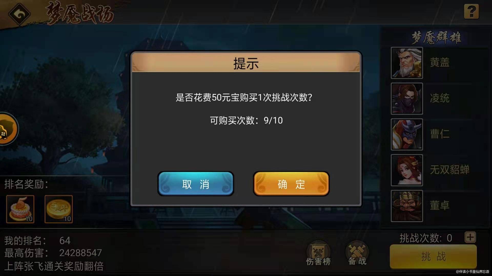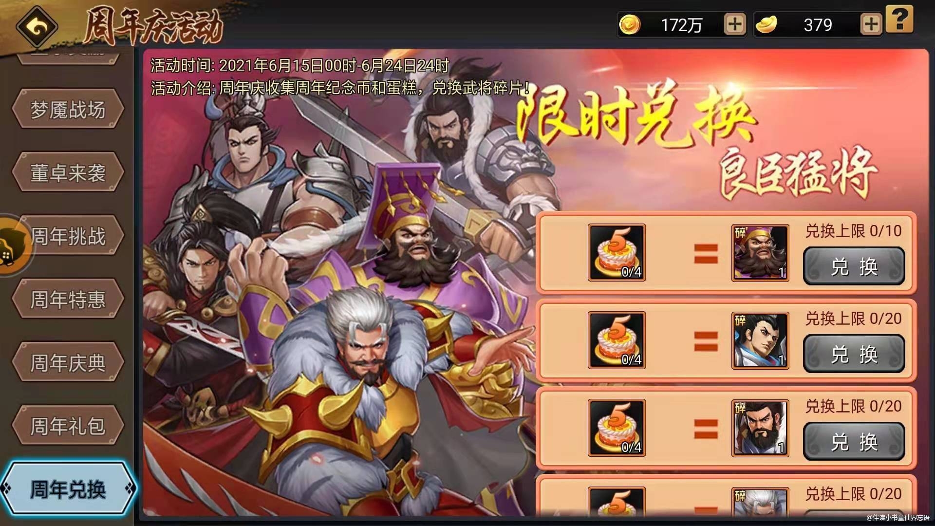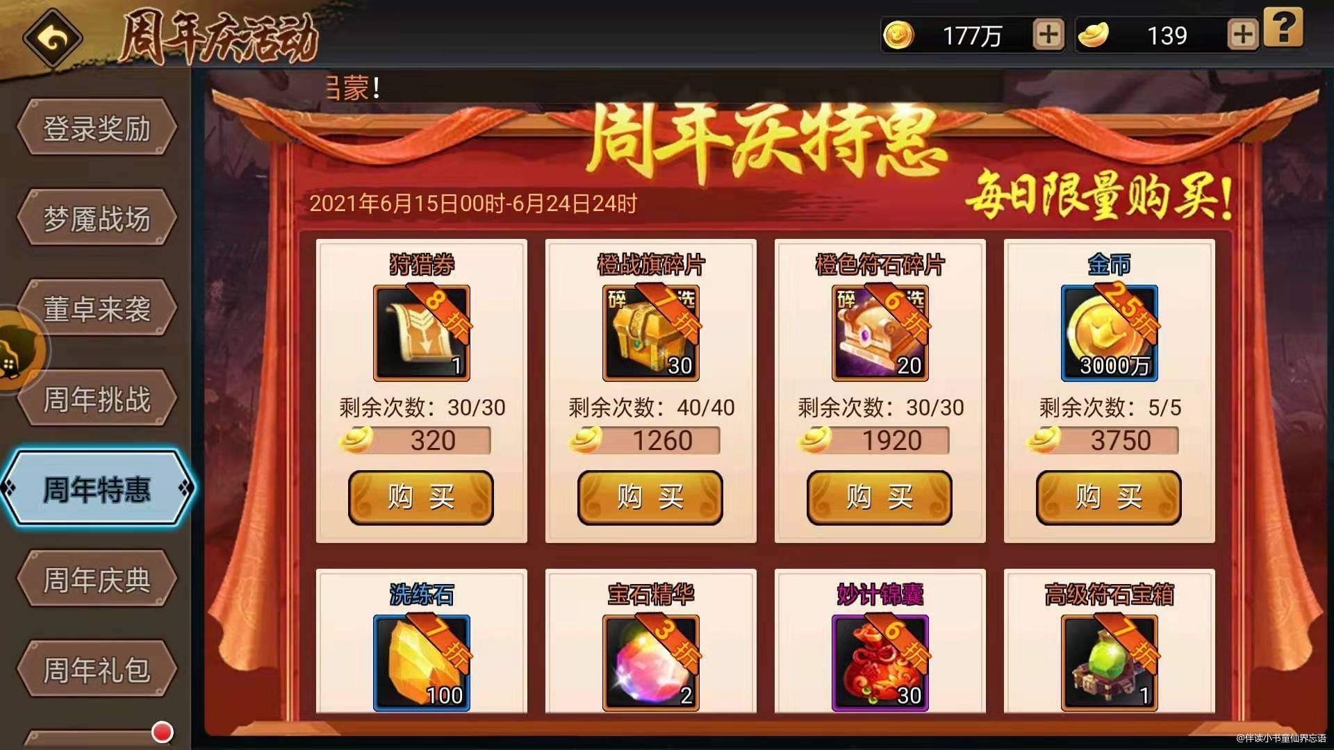 五一种树扑了个空,周年庆一如既往,惠利程度和去年周年庆一致。悟饭平台如约提前三天更新庆典,那全渠道、果服等平台就是18号开启华诞庆典,为期一周! 新武将董卓还是6折的底价一次性招募,特惠商城则30个碎片一组7折,活动第二天,特惠商城中无双诸葛亮和黄月英这对CP和符石碎片六折,金币2.5折折,狩猎券、锦囊、高级宝箱等琳琅满目…… 周年挑战、周年庆典和周年兑换,换汤不换药,去年参加过的小伙伴们也都不会陌生。 周年庆典能翻出8个董卓碎片(周年兑换七天可以兑换董卓碎片70个,加上其它环节,普通玩家一百个左右难度不大),梦魇副本每天额外240元宝能购买十次挑战机会,但董卓碎片爆率2-3次这个区间(4-6个),13次能产出二三十个蛋糕和一百来个纪念币,大家可根据需求酌情购买挑战次数
