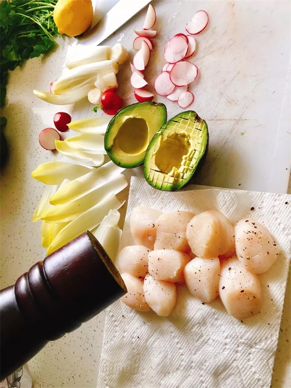 材料:玉兰菜,牛油果,带子,洋葱,香菜,柠檬,小红萝卜。