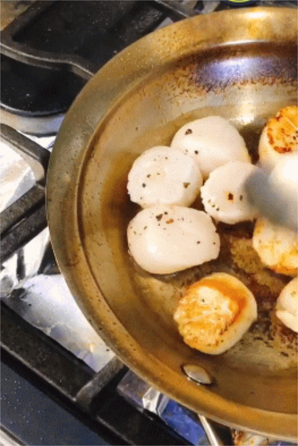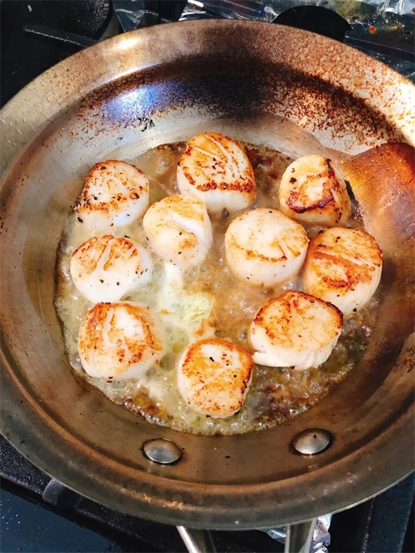 4:煎锅烧热,下油,下调味好的带子,煎30-40秒,重点!一定不要翻,煎足时间再翻动,这样才能煎出漂亮的金黄色~