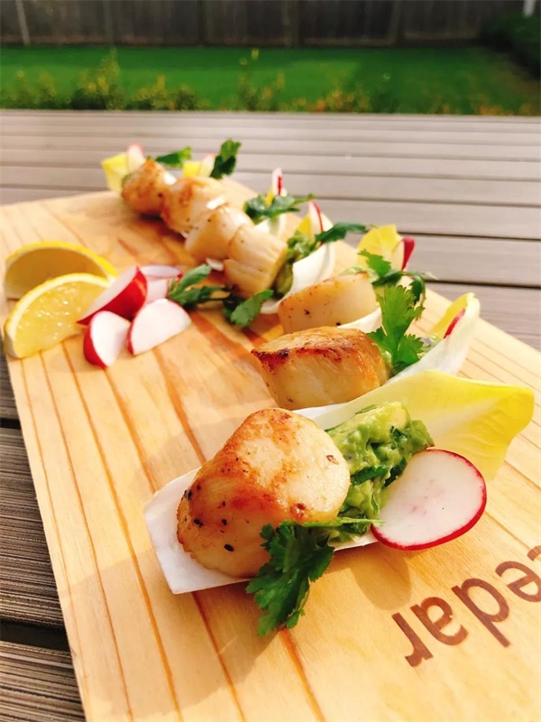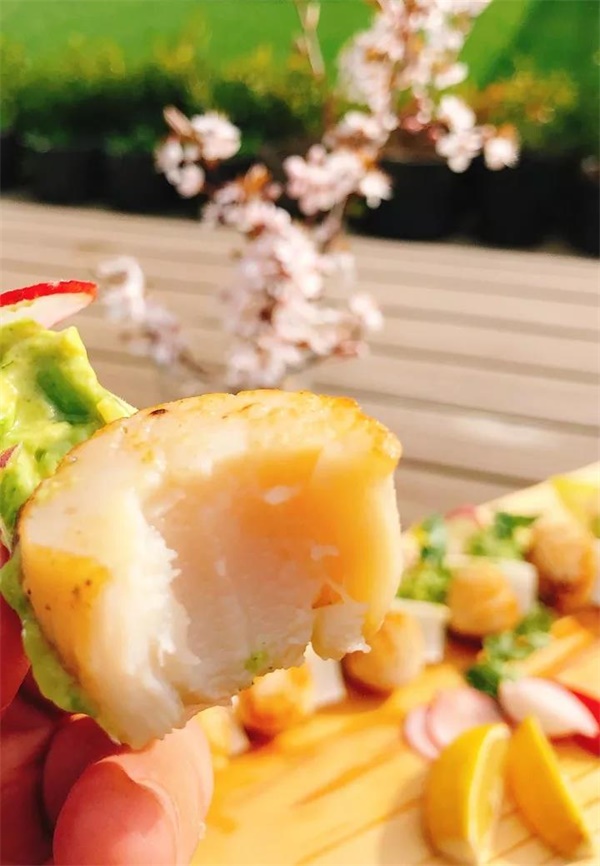 德丽莎抓起一个带子盏咬了一口:嗯~~~带子煎的恰到好处,外表酥脆内部Q弹,牛油果酱味道丰富,配上清苦的玉兰菜,和一丝丝柠檬的微酸,非常开胃啊!