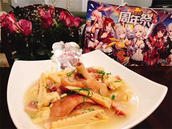 舰长:我看一下,哦,春笋、玉兰菜(苦白菜)、小红萝卜、香菜,这不都是春天的食材吗……说起来德丽莎的生日到了啊,做个春季的季节菜吧!(挽起袖子)交给我吧!春笋加上咸肉、蹄膀,烧个腌笃鲜,玉兰菜配上海渊城的特产深海大带子,做个玉兰菜带子盏!是春天的味道呢~带着微苦和清新的滋味!