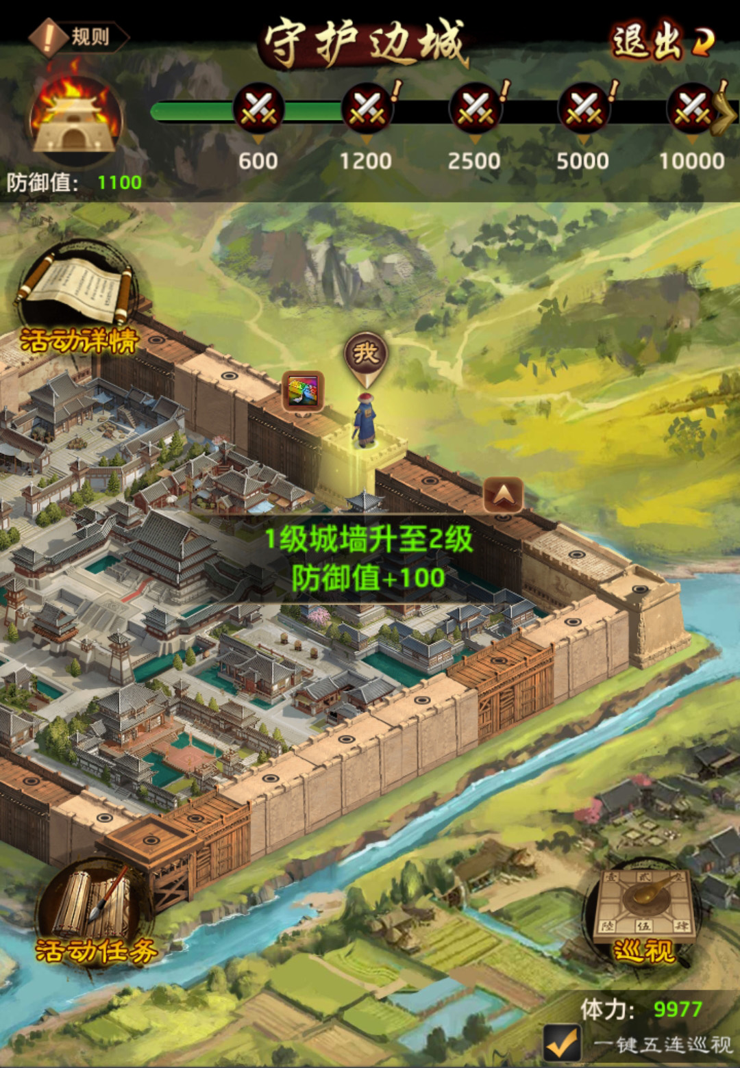 大人每次巡视完成时,落脚点的城墙等级将提升1级,并增加对应的防御值。城墙等级初始为0级,最高可升级至10级。