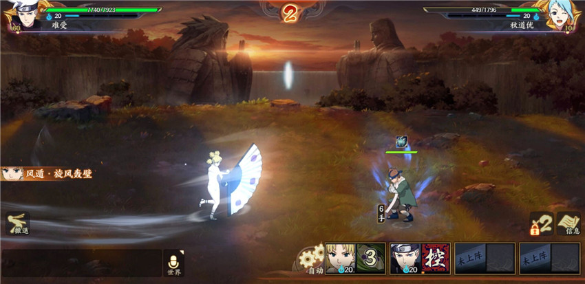 奥义技能-【风遁·旋风轰壁】:对敌小队3体造成70%伤害,选定敌人附带击退。必杀时伤害提升30%,目标+6.(冷却回合3,进场冷却1,消耗查克拉20)