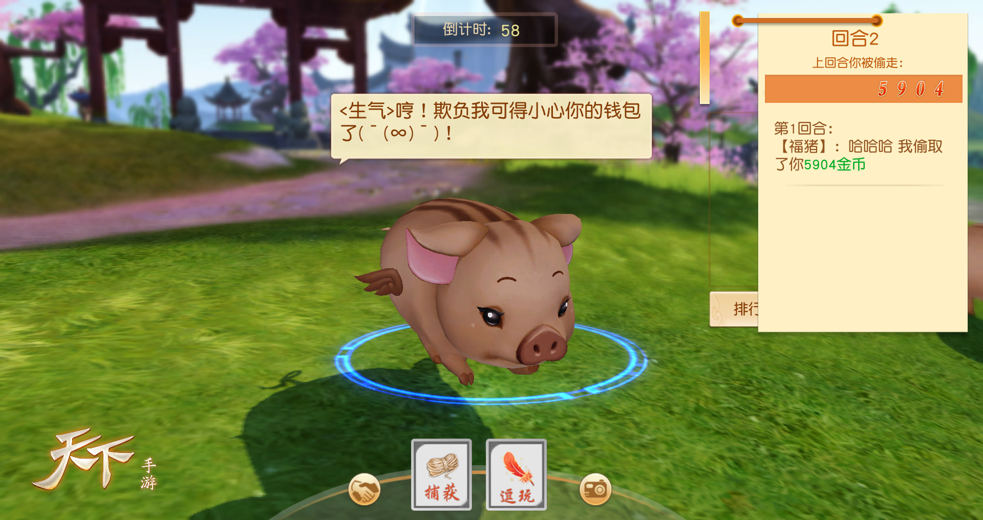 猪猪太调皮,总喜欢抢人钱袋怎么办?当然是抢回来了!《天下》手游大荒福猪再现大荒,等你来“逗猪”!福猪?跳跳喜欢在大禹村和无双城窃取行人的军资,机智勇敢的少侠是否想趁机“打劫”一波,将它抢夺来的军资全部据为己有呢?鸣雀林和桃李花林的福猪?金金则喜欢盗取金币,少侠如果恰巧路过,也可以尝试“打劫”它试试看哦!前去逗玩福猪,不管是将其成功捕捉,还是令它落荒而逃,都可以获得福猪最后一次偷取财物的双倍奖励!如此多的奇珍异宝,不劫白不劫,带上你的逗猪小伙伴,一起愉快“打劫”嗨起来!