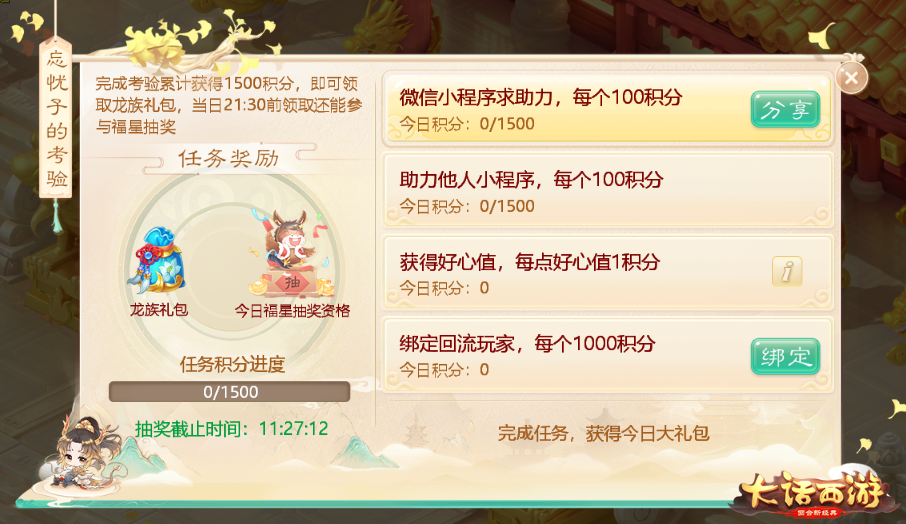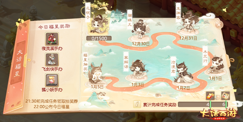 2019年12月29日-2020年1月3日期间,玩家每日10:00在“活动”界面参与相关任务,接受1位龙族角色的挑战,完成分享求赞、每日助力、好心值获取、绑定回流玩家等任务,就能获得积分。玩家在活动期间每日21:30前获得1500积分,就可以领取奖励并参与抽取当日22:00的龙族福星大奖,全服每日仅有1名!
