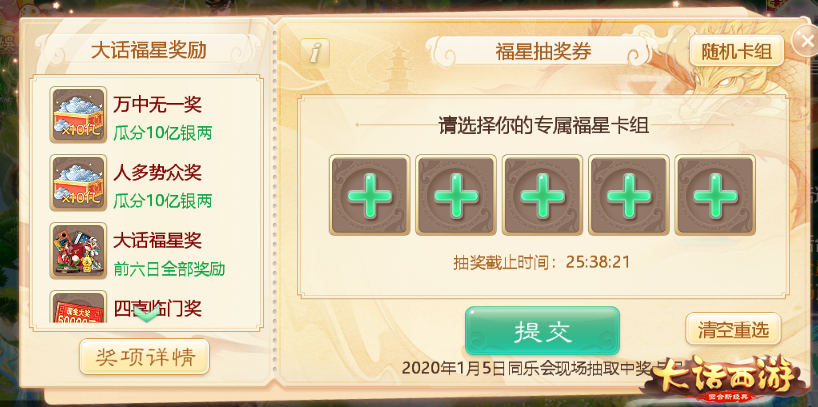 1月5日晚,大话暖春同乐会活动现场除了将抽取福星卡组之外,猜对福星卡组中单个号码位置的玩家还可以获得对应奖励,猜中越多奖励越大!10亿银两奖金、5万元现金、限时时装、珍稀游戏道具统统奉上!