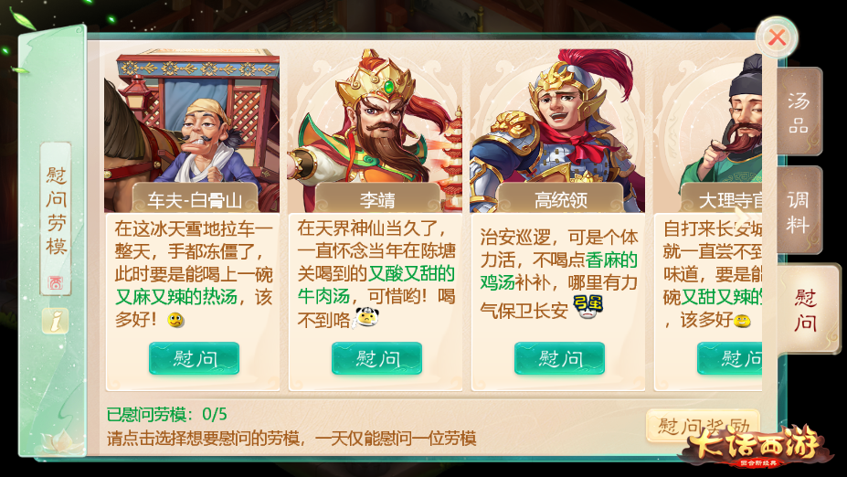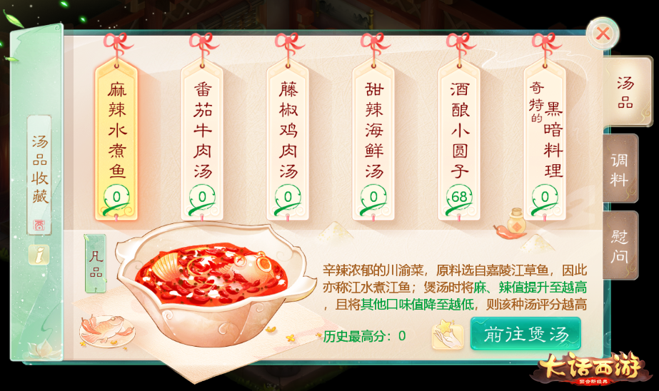 每日第一次煲汤可以获得经验和物品奖励,煲汤的评分也会被记录进“汤品收藏”,大家可以多多尝试自己的手艺,煲出更高评分的汤刷新自己记录。在活动期间,大家可以把煲好的汤送给五名大话劳模(NPC)其中之一,对他们进行慰问,需要注意的是,每个劳模都有自己偏好的口味,根据他的口味送出高评分的汤,就能获得更多奖励!