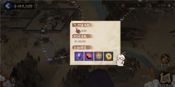 在地图内点击各个位置点,可看到清扫此处需要消耗的时间与气力值以及清扫完毕后可获得的奖励种类。