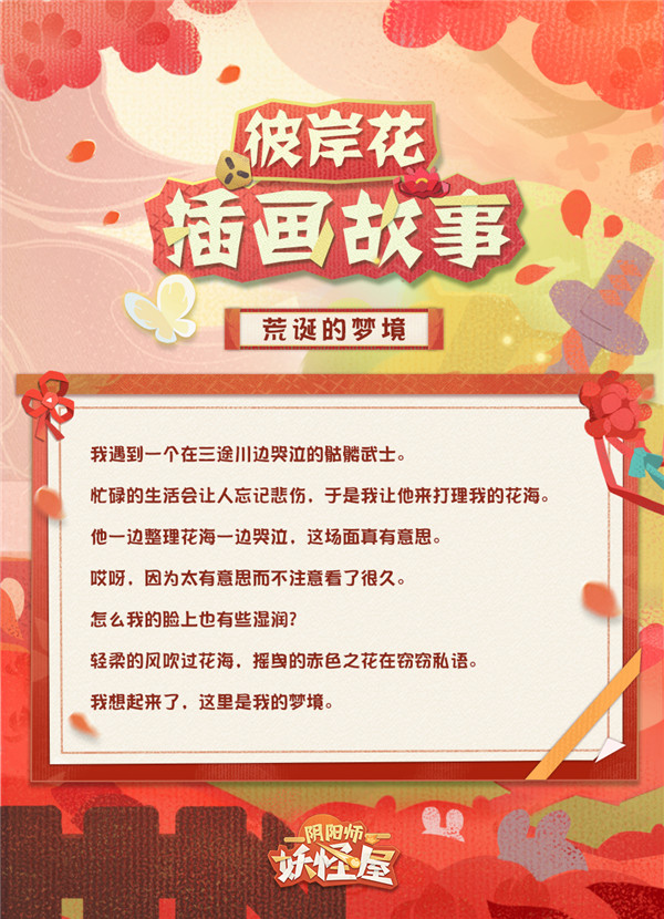 夜幕降临,万物都归于宁静。在沙沙的虫鸣声中,彼岸花隐约听见了一阵微弱的啜泣。她顺着这声音来到了一片广袤的花海,赤色的花影随风摇曳,而她的目光却汇聚在了花海中那个巨大的身影之上……