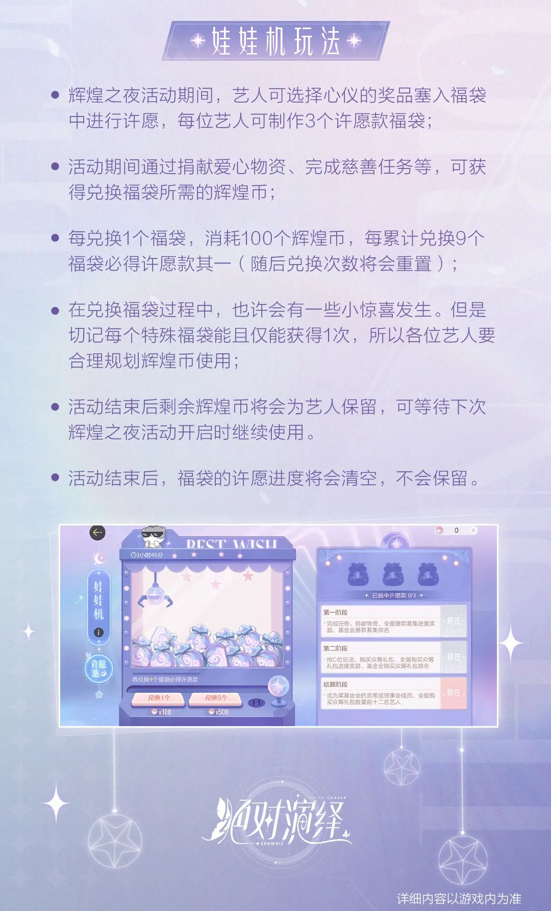 星光汇聚,爱心接力。7月28日(本周四)更新后,全新慈善晚会玩法“辉煌之夜”盛大开幕。在群星璀璨的“辉煌之夜”,留下专属于你的红毯印记吧!
