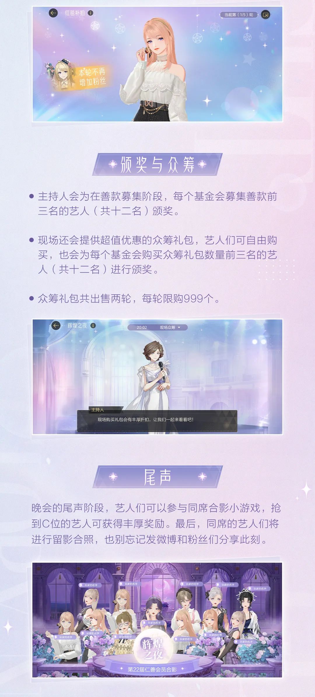 加入心仪的基金会之后,艺人们便可以代表基金会出席“辉煌之夜”慈善晚会了,记得提前准备好妆发和礼服,才能在走红毯和拍摄定妆照时秒杀菲林!(注意:每届晚会只能加入一个基金会,不可以更改哦!)