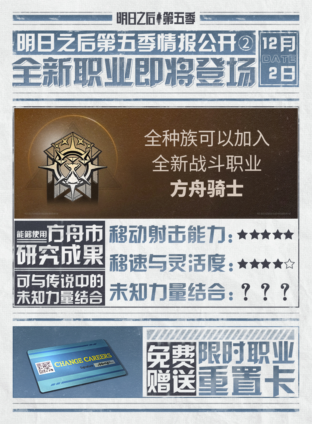 而且!重要的来咯,幸存者们心心念念的《职业重置卡》也会在新职业登场之际给大家免费赠送哦~需要等12月2日上线查看活动!