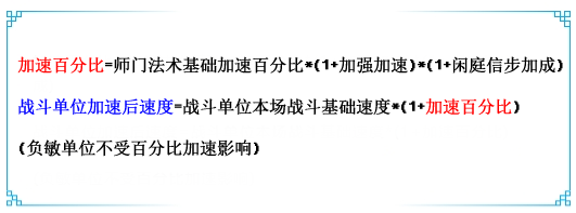男魔玩家枸杞群速法术基础加速百分比为20%,加强加速属性为80%,闲庭信步天策符在我方站立单位数>9时增强效果为8.4%