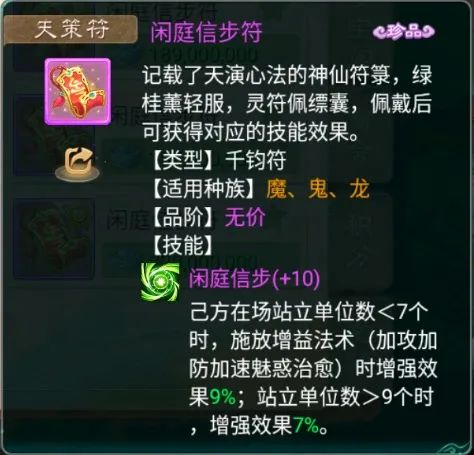例如:男魔玩家枸杞的天演策等级为100级,佩戴+10闲庭信步天策符,该天策符效果为: