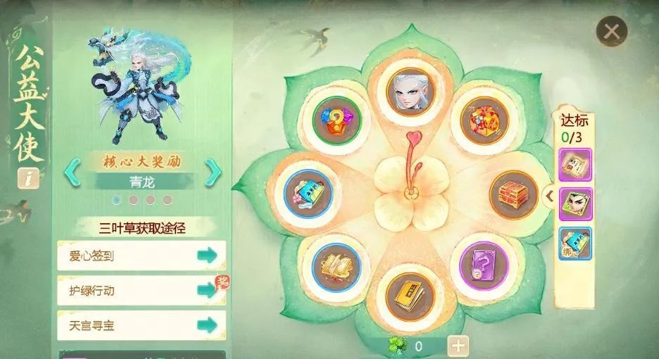 1)海量福利持续派送中,参与以下活动:爱心签到、护绿行动、天宫寻宝,即可免费获得三叶草,进行春日公益大使大转盘,抽取豪华福利季奖励哦!