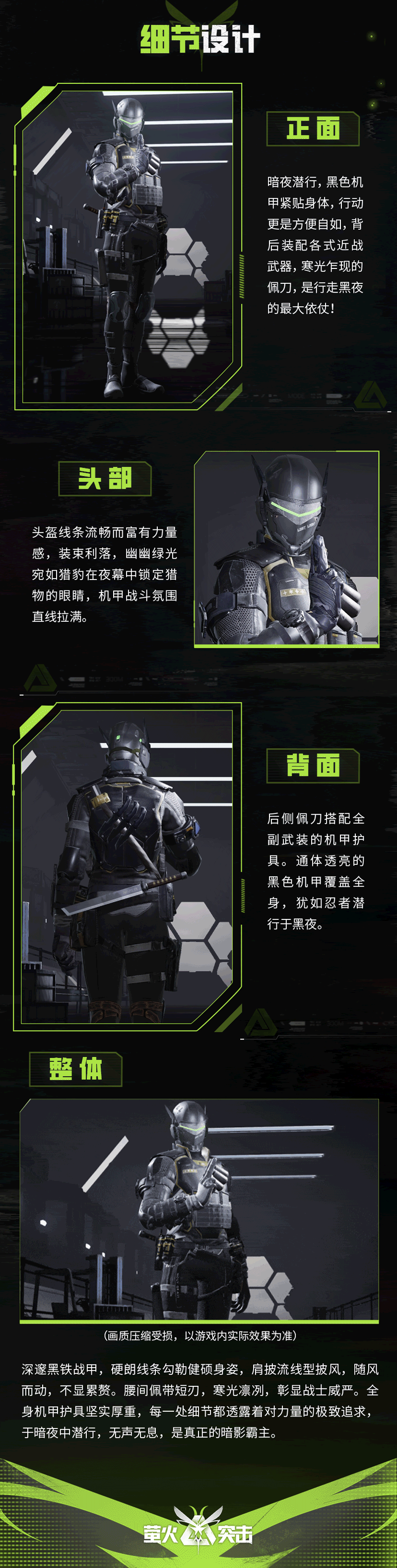夜幕独行,神秘莫测,于寂静狂澜暗藏。经典流传,风华再现,一起领略经典的魅力。两套全新时装都将相继上线商城,萤火虫们快进入萤火突击,一起体验新版本的新时装【暗夜行者】【黄金年代】吧!