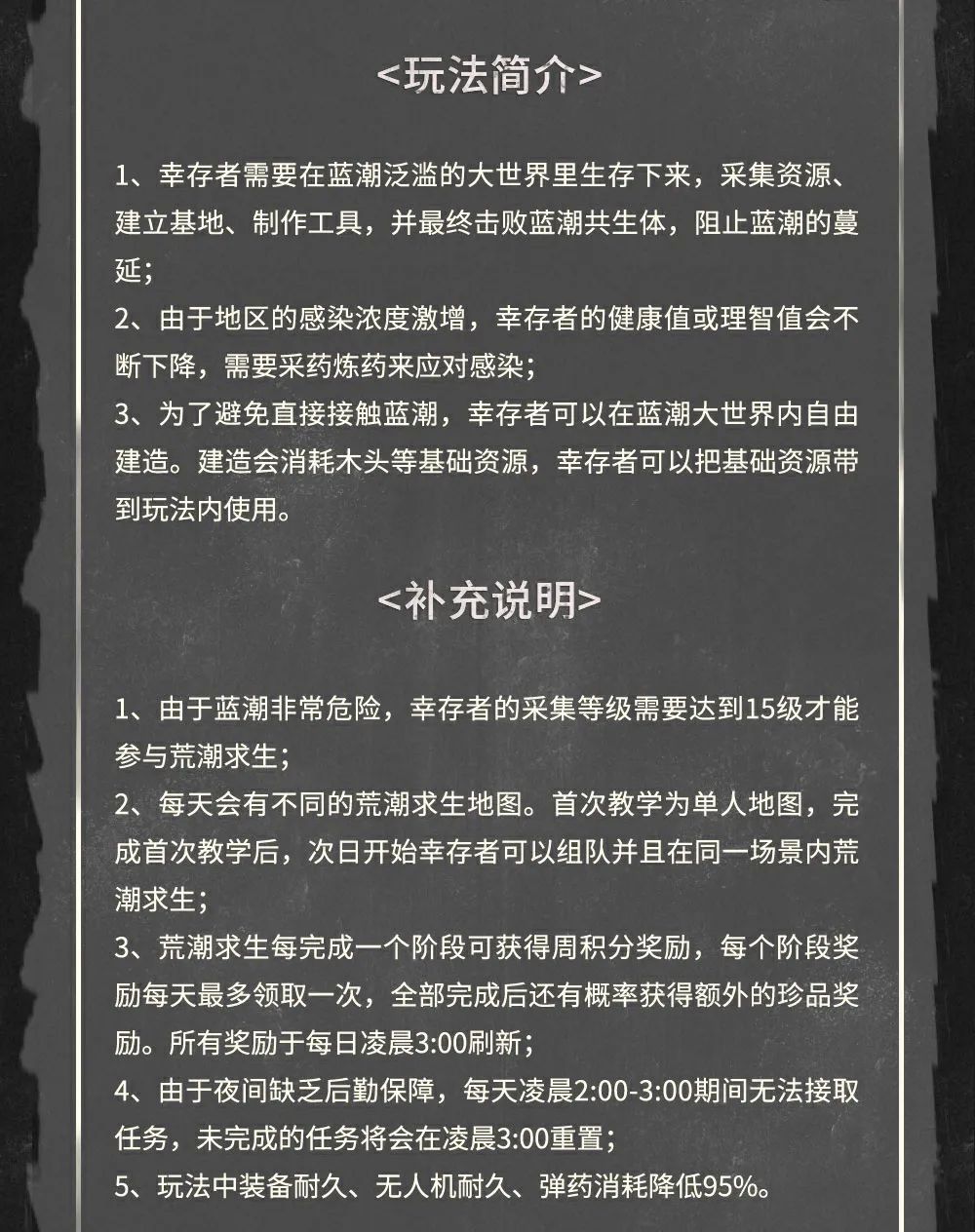 人们必须抱团取暖,冷静找寻怪物弱点抵抗侵袭,共同获取野外资源脱险求生,利用手中的物资跨越重重障碍……