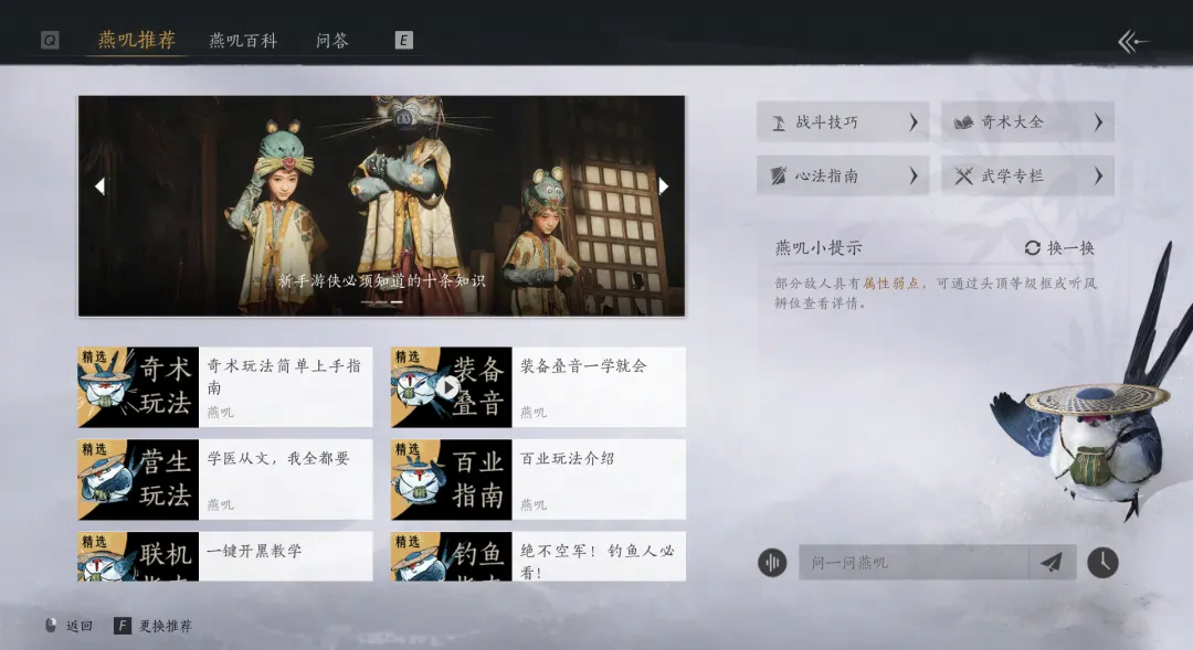 同时,我们也让燕叽狠狠补充了一波知识储备,游侠们在闯江湖中遇到的99%的问题,它都可以解决了!