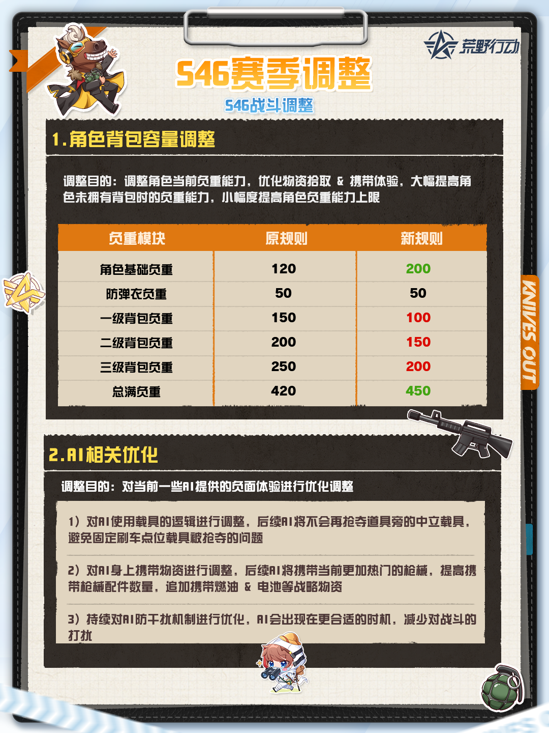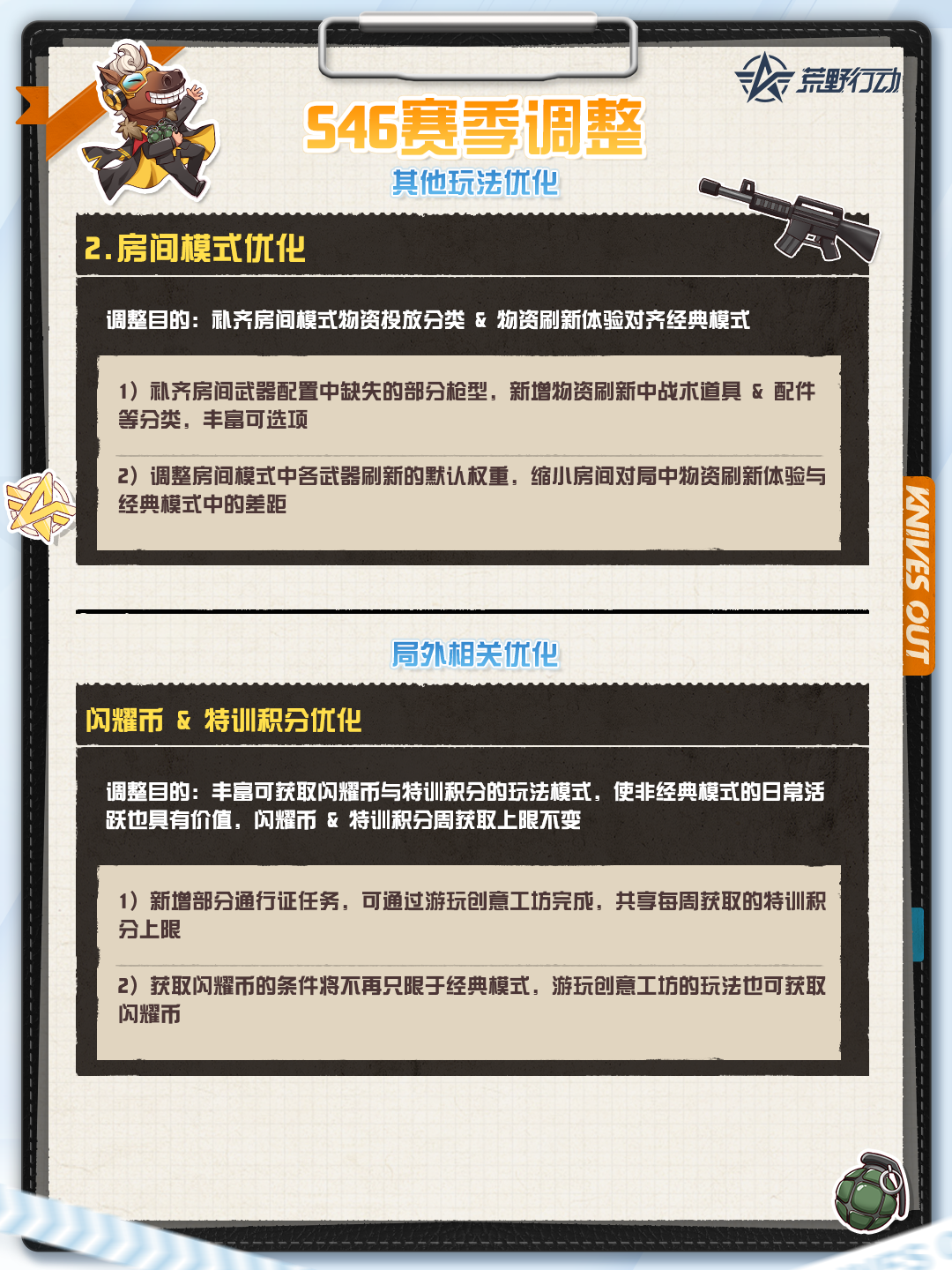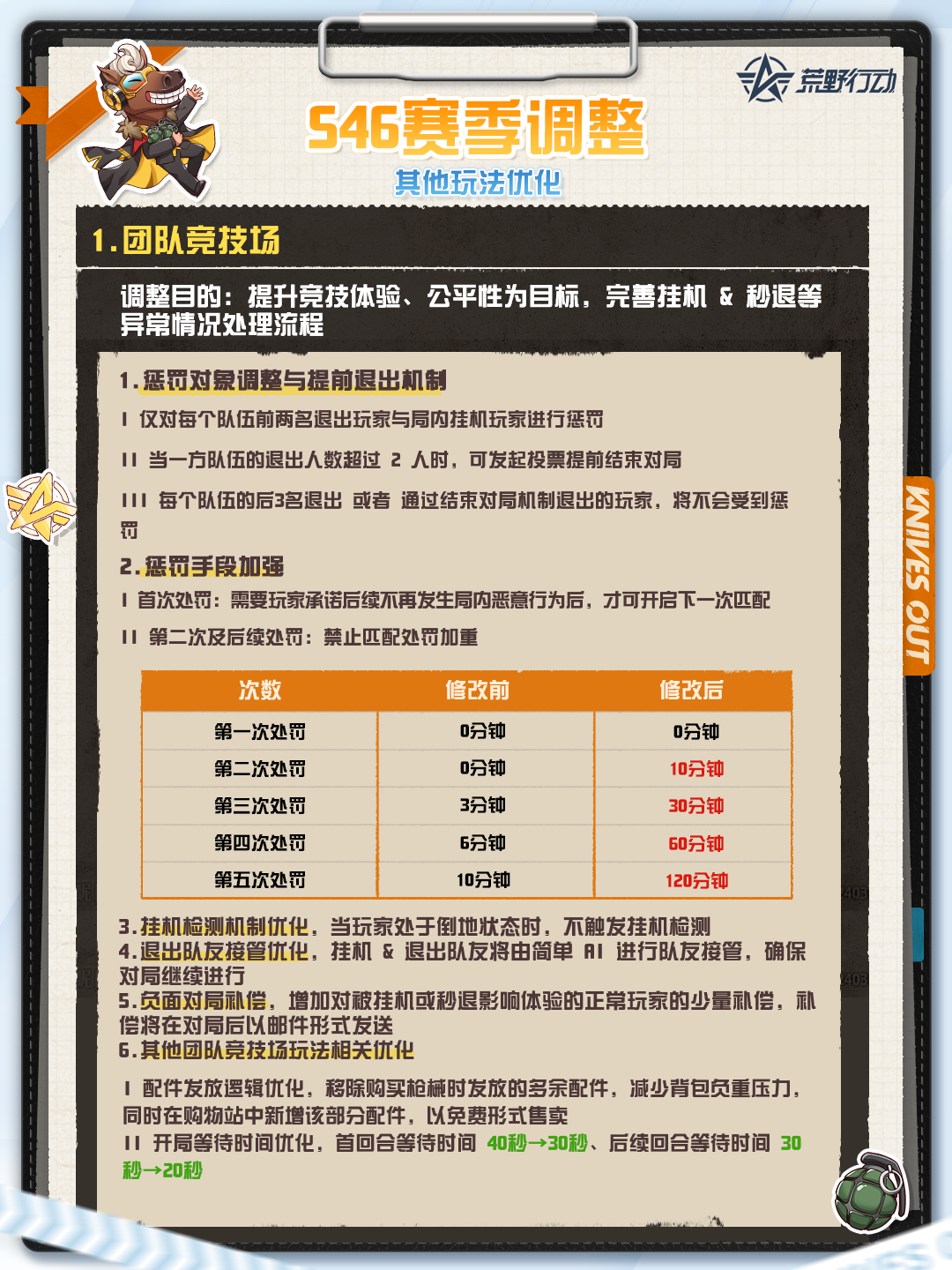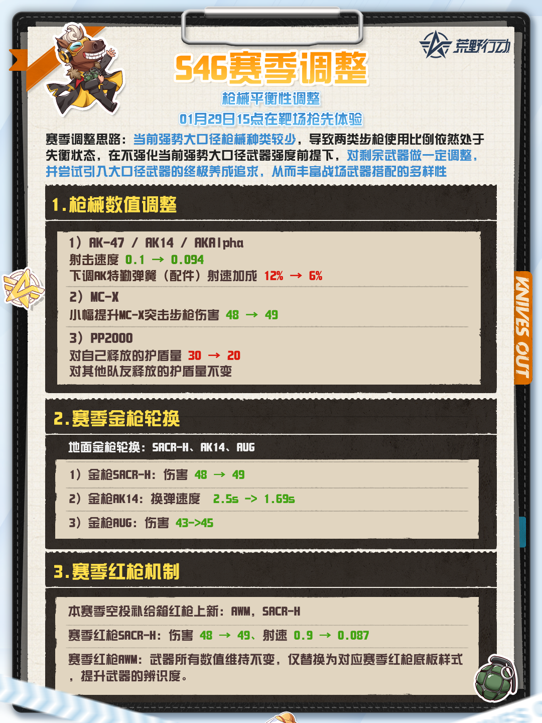 内含大量干货!多图带你了解S46赛季新改动!飓风半岛调整物资机制,优化缩圈机制&复杂地形!【飓风半岛火箭基地据点】焕新改动!PP2000医疗枪护盾调整,新增赛季红枪机制!对团队竞技场挂机&秒退行为加重处罚!AI逻辑优化,行为逻辑更合理调整数值后的武器将在1月29日(周四)15点在靶场更新,荒友们可以前往体验!同时欢迎大家在评论区提出宝贵的意见!