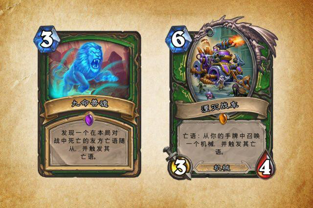可是到了游戏中,亡语机械猎之所以强势除了九命兽魂,也少不了湮灭战车的帮助。湮灭战车和九命兽魂搭配在一起让机械猎的场面生生不息无穷尽,九命兽魂发现湮灭战车并触发亡语,拉出湮灭战车又触发亡语拉出其他机械随从再触发亡语,想想都刺激。