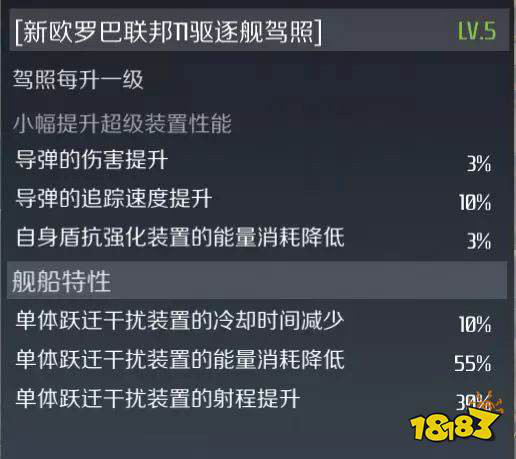 在驾照属性的加成中指引了装配的两个方向,一是跃迁干扰装置的加成,二是武器属性的强化。作为一个定位为“重装”“拦截”的驱逐舰,装置槽中跃迁干扰装置自然是首选。在《第二银河》的世界中,提供了两种跃迁干扰装置可供选择,分别是: