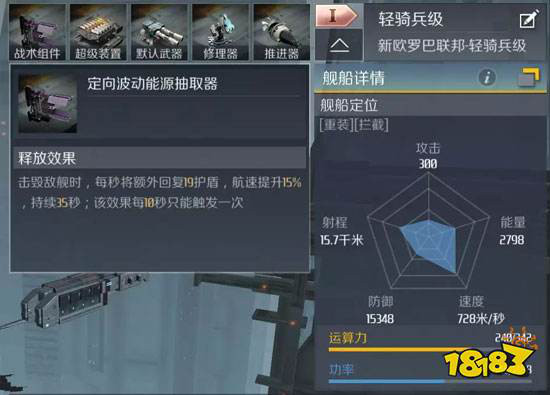战术组件:击毁敌舰时,每秒将额外回复19护盾,航速提升15%,持续35秒;该效果每10秒只能触发一次。