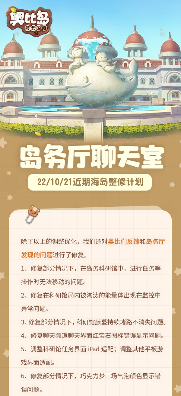 各位小奥比好呀,有一段时间没有跟大家见面了,许多小奥比好奇厅厅最近都在忙些什么?其实在这段时间里,我们依然在持续收集和讨论奥比们的建议和反馈,比如前段时间让兜兜发布的「奥比时装风格调研」,就是我们工作的一部分。此外,我们的海岛施工队还进行了一些整修和建设,具体的岛建优化计划和调整结果,现在就跟大家一起分享~