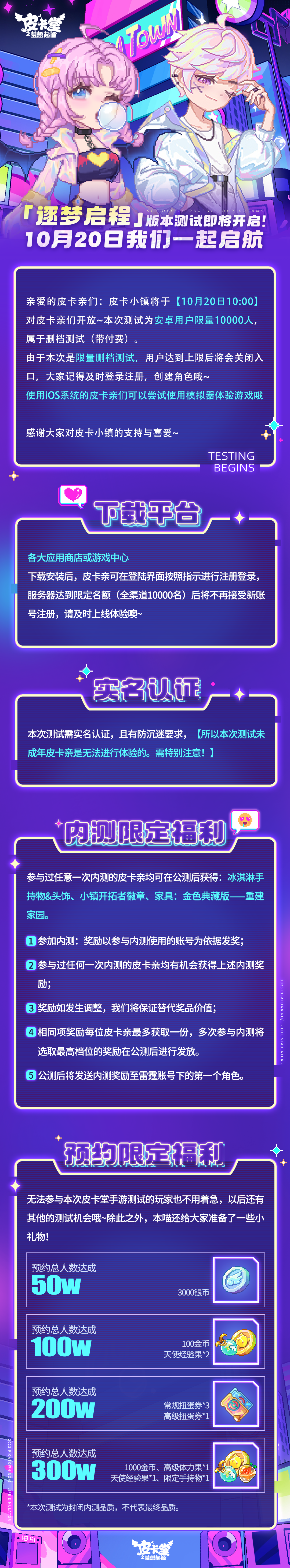 皮卡小镇「逐梦启程」版本测试将于【10月20日 10:00】对皮卡亲们开放~