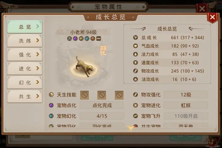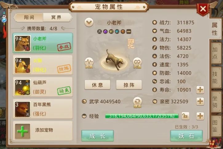 二哈大晴天:不管是端游还是手游的道友,其实对野狗都不陌生。道友这只野狗,强满幻4算非常不错了,只不过在亲密度、武魂和镜石方面还有很大的提升空间。很期待道友后续的进一步提升,看看野狗作为战宠的培养极限在哪里。