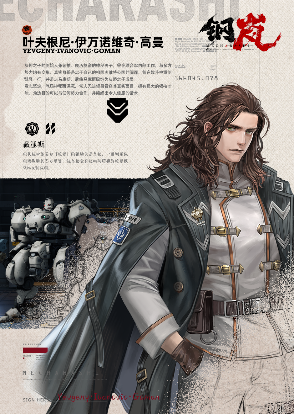 一个如迷一样的男子,没有人知道他的年龄,没有人知道他的过往,他从不刻意隐瞒,却并未有人提及。为北陆联合效命?和晨星同盟有瓜葛?奥维特公国的间谍?这每一个身份都并未被证实过,但人们更愿意相信他们所想象出来的叶夫根尼。不过,尽管他总是行踪不明,目的成谜,但作为灰烬之子的领袖,他是成功的,起码他收获了所有组织成员的信任。