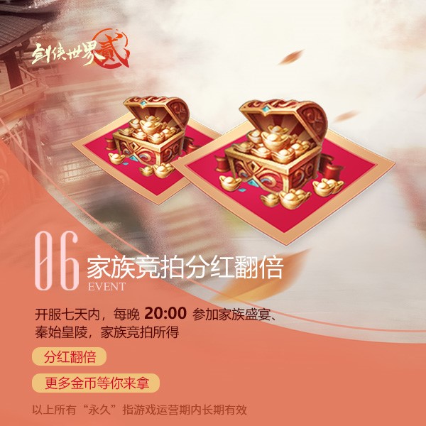 开服七天内,每晚20:00参加家族盛宴、秦始皇陵,家族竞拍所得分红翻倍、更多金币等你来拿!